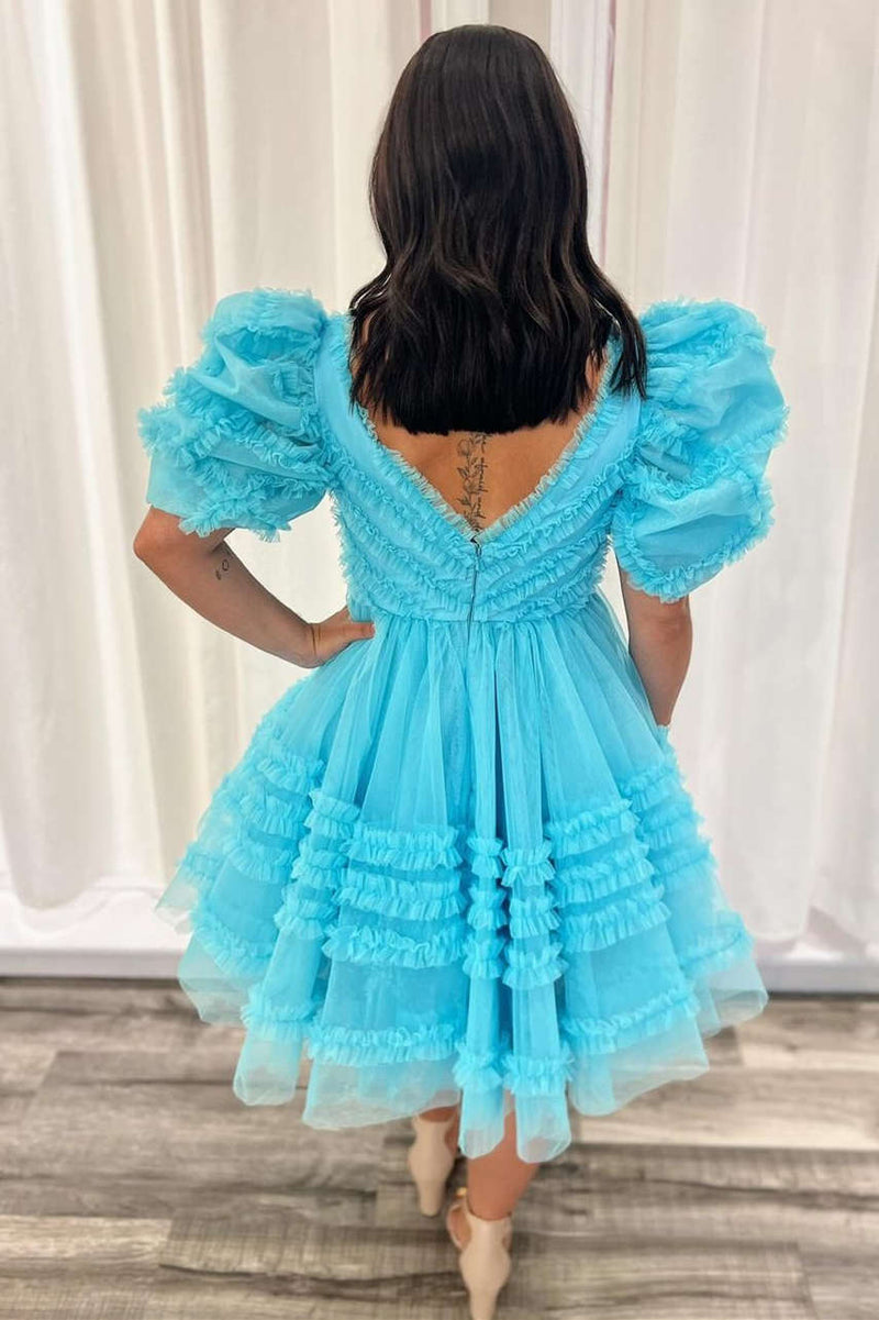 Light Blue Corset Balloon Sleeves Ruffle Short Homecoming Dress