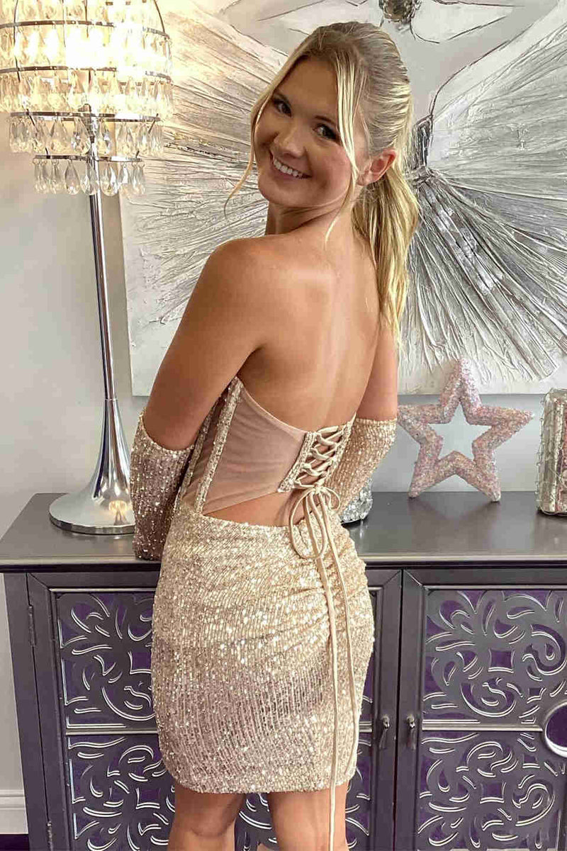 Strapless Champagne Corset Sequin Homecoming Dress with Gloves