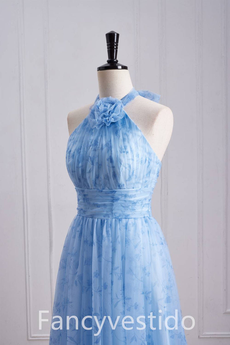 Halter Blue Floral Print A-Line Maxi Dress with Rosette