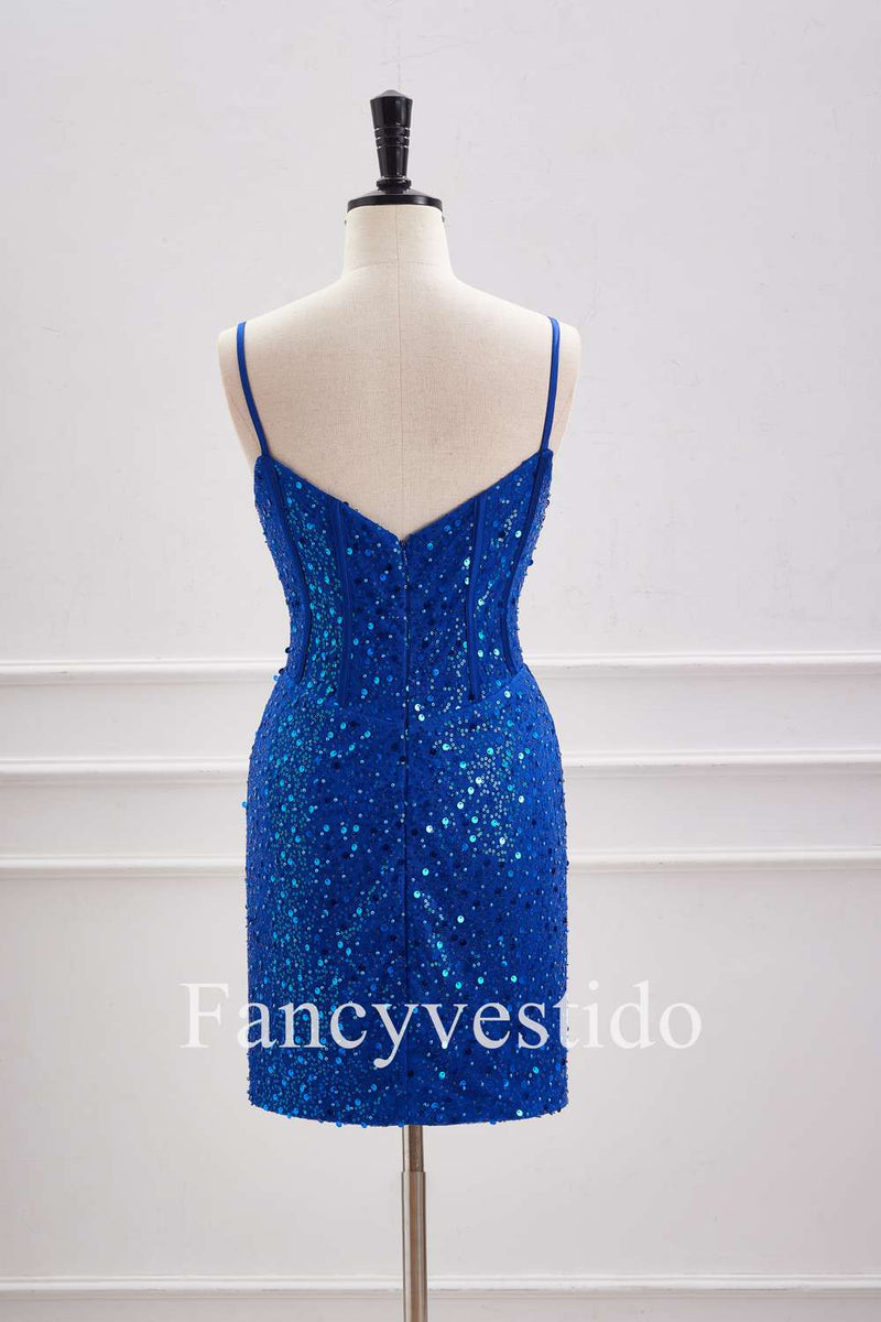 Straps Plunging Neck Royal Blue Sequin Tight Homecoming Dress