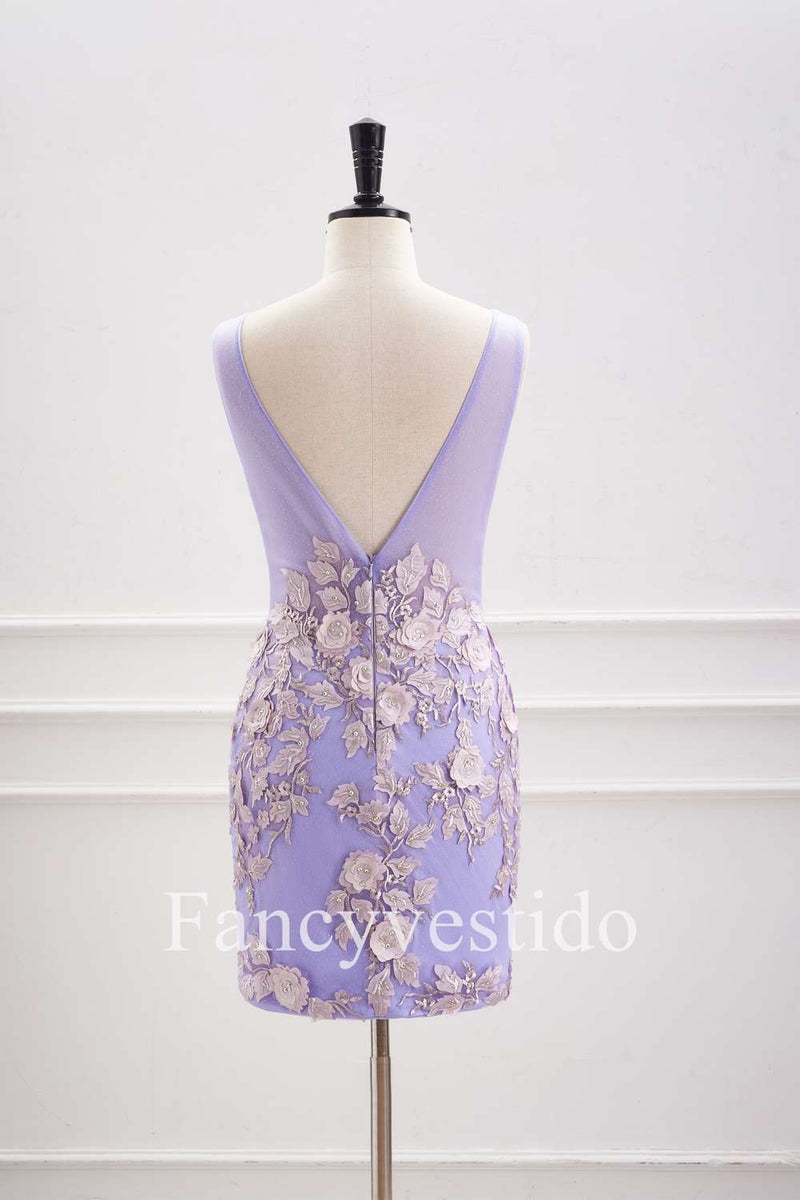 Plunging Neck Lavender 3D Flowers Fitted Homecoming Dress