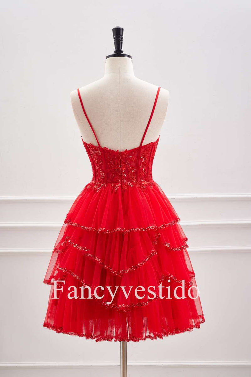 Straps Red Plunging Neck A-Line Tiered Homecoming Dress