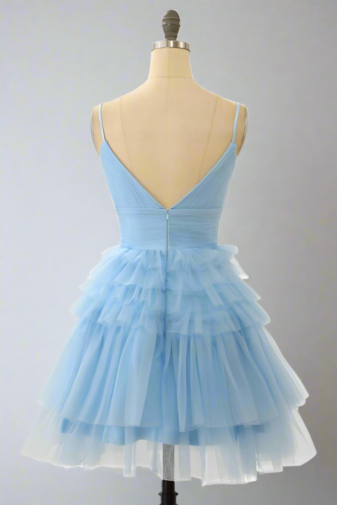 Straps Light Blue V-Neck Ruffle Homecoming Dress