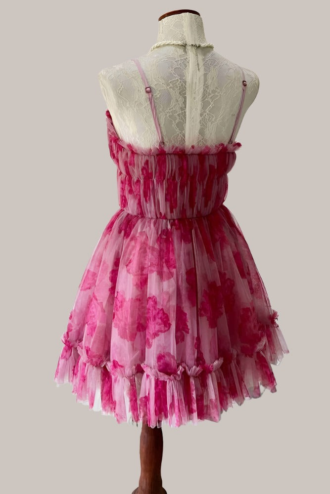 Hot Pink Straps Floral Print Short Homecoming Dress