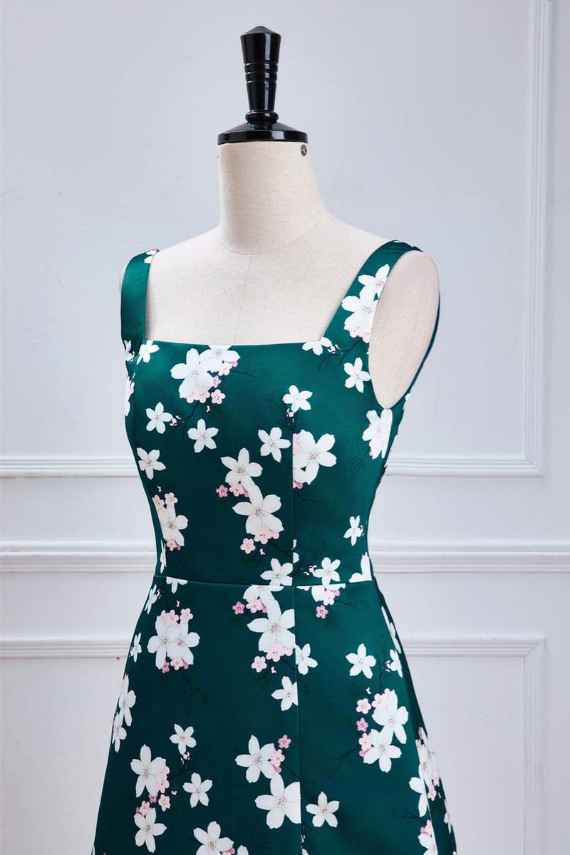 Square Neck Green Floral Print Long Bridesmaid Dress with Slit