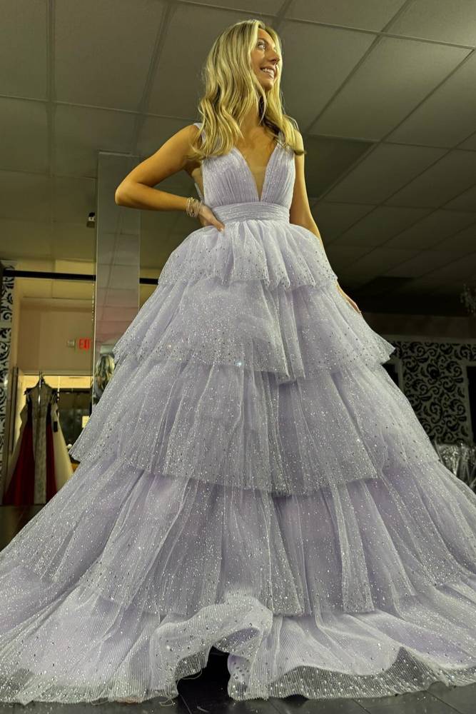 Lavender V-Neck Sequins Tulle Ruffle Prom Dress