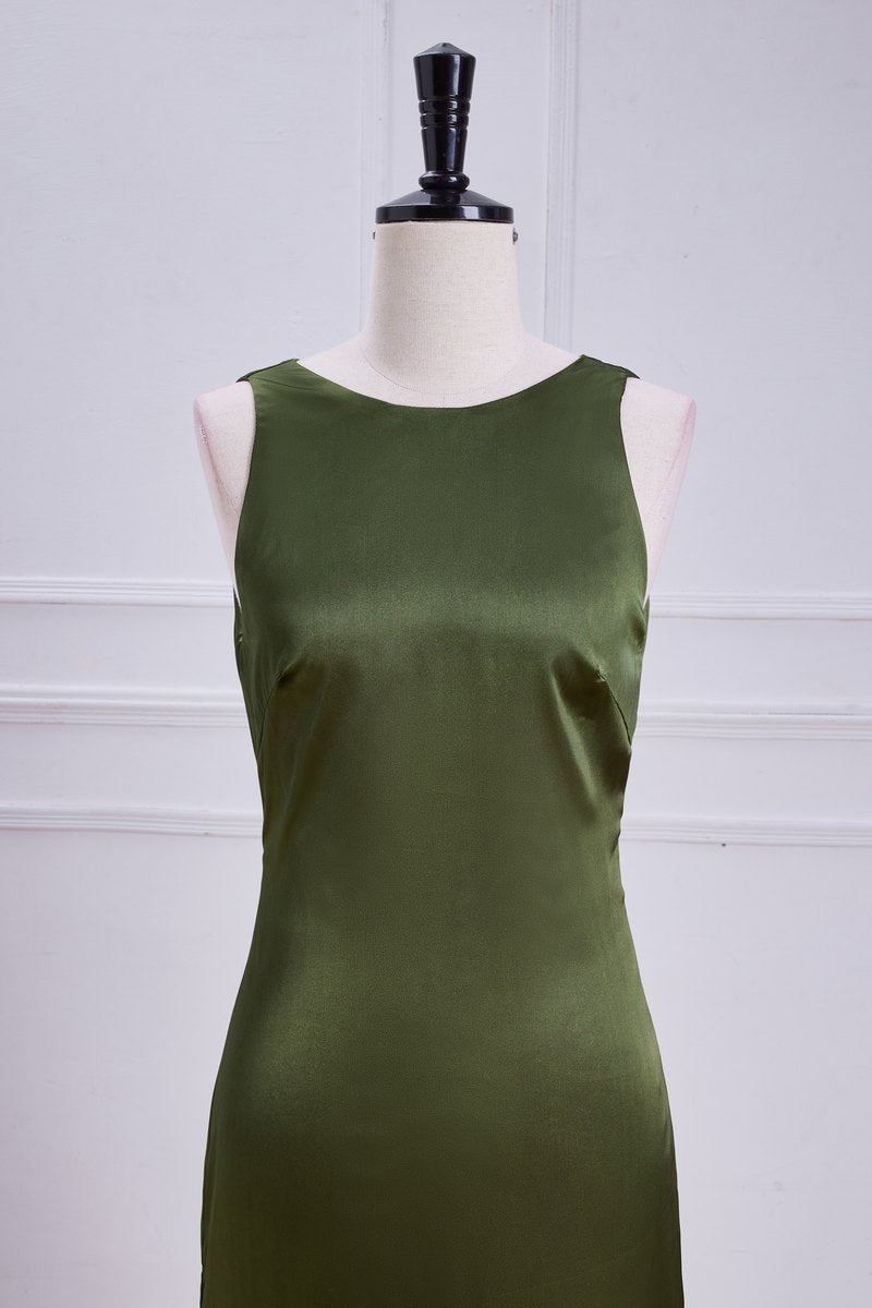 Olive Green Satin Jewel Mid-Calf Dress Homecoming Dress With Bow