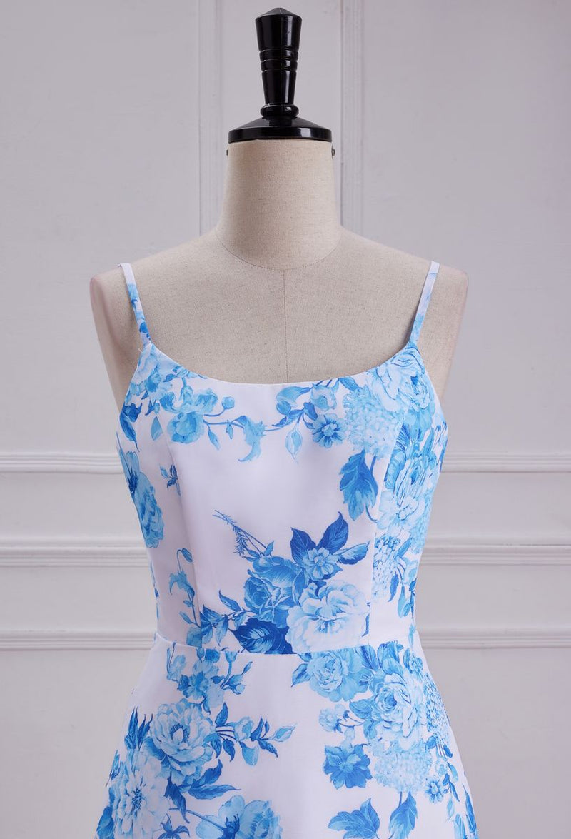 Blue Floral Print A Line Spaghetti Strap Dress Chiffon Prom Dress