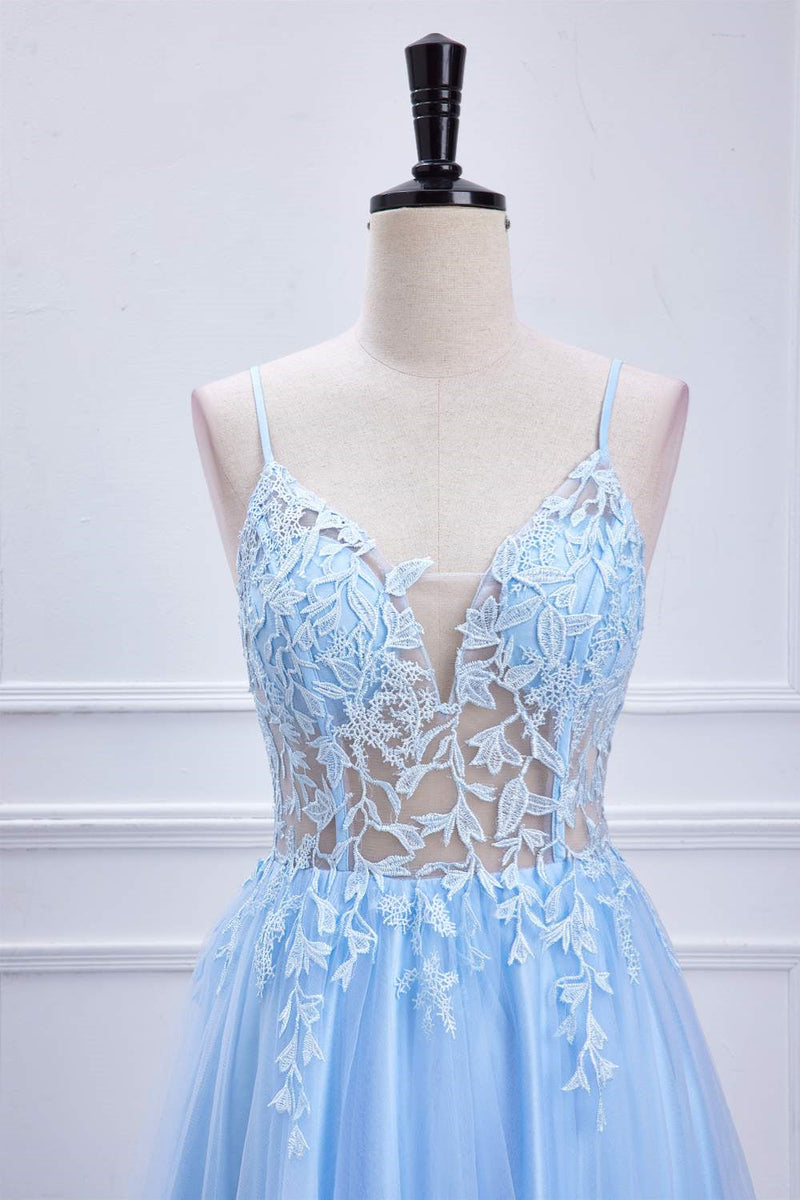 Straps Plunging Neck Light Blue Ruffle Prom Dress with Appliques
