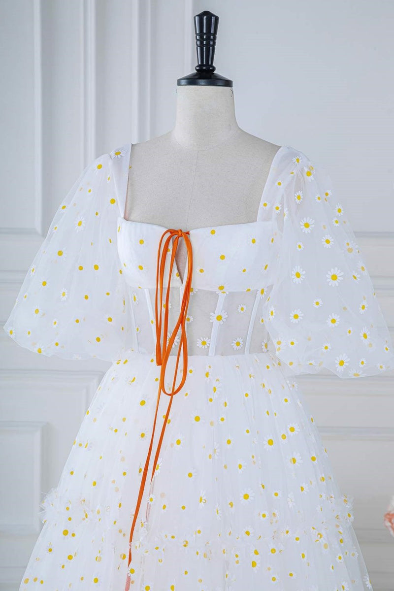 Square Neck White Daisy Print Tulle Long Formal Dress