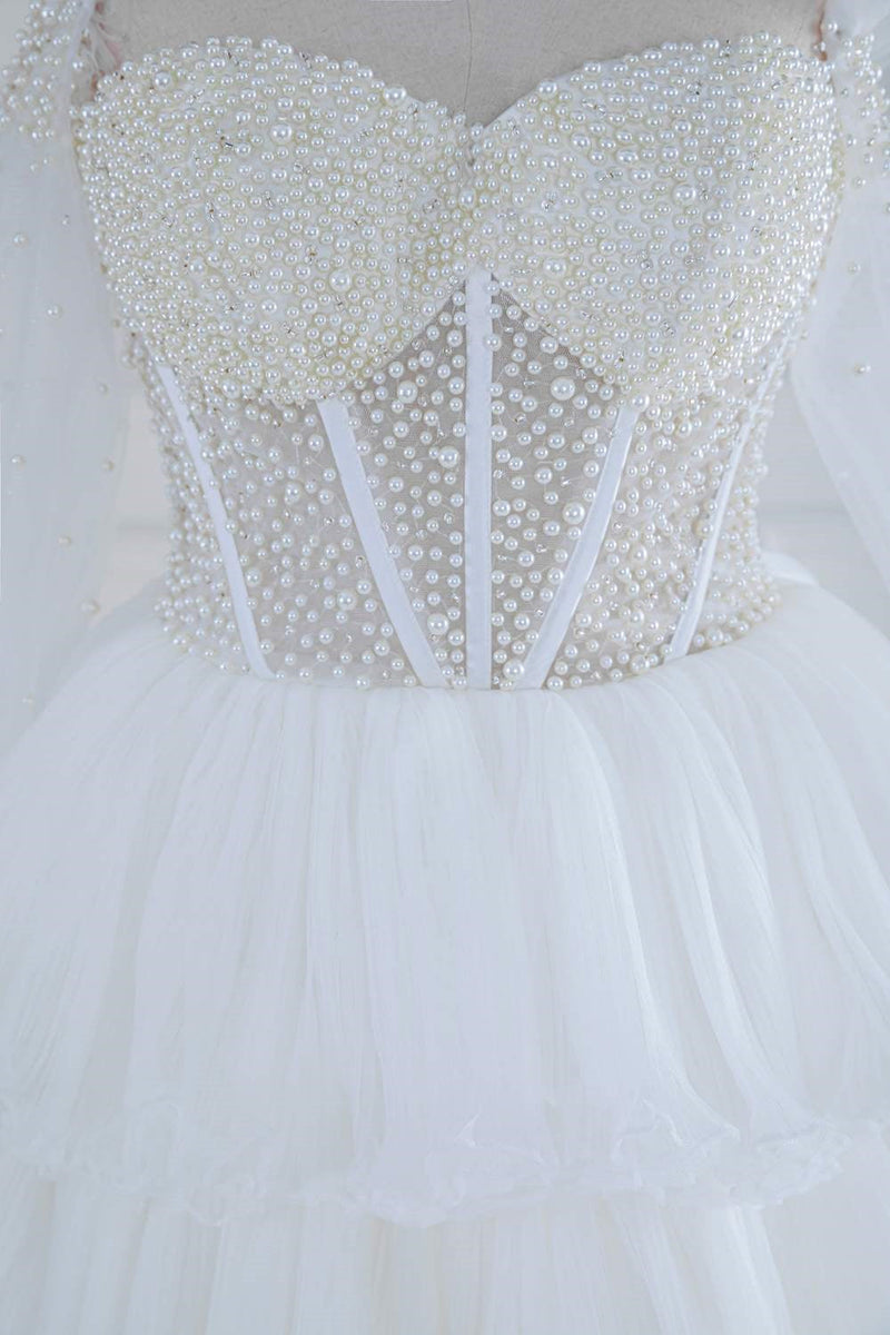Off the Shoulder White Beaded Top Ruffle Tiered Prom Dress