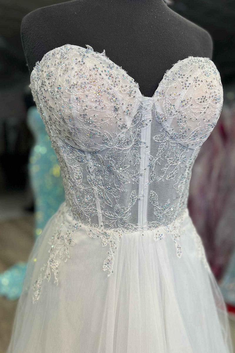 Strapless White Lace Corset Long Formal Dress with Rhinestones