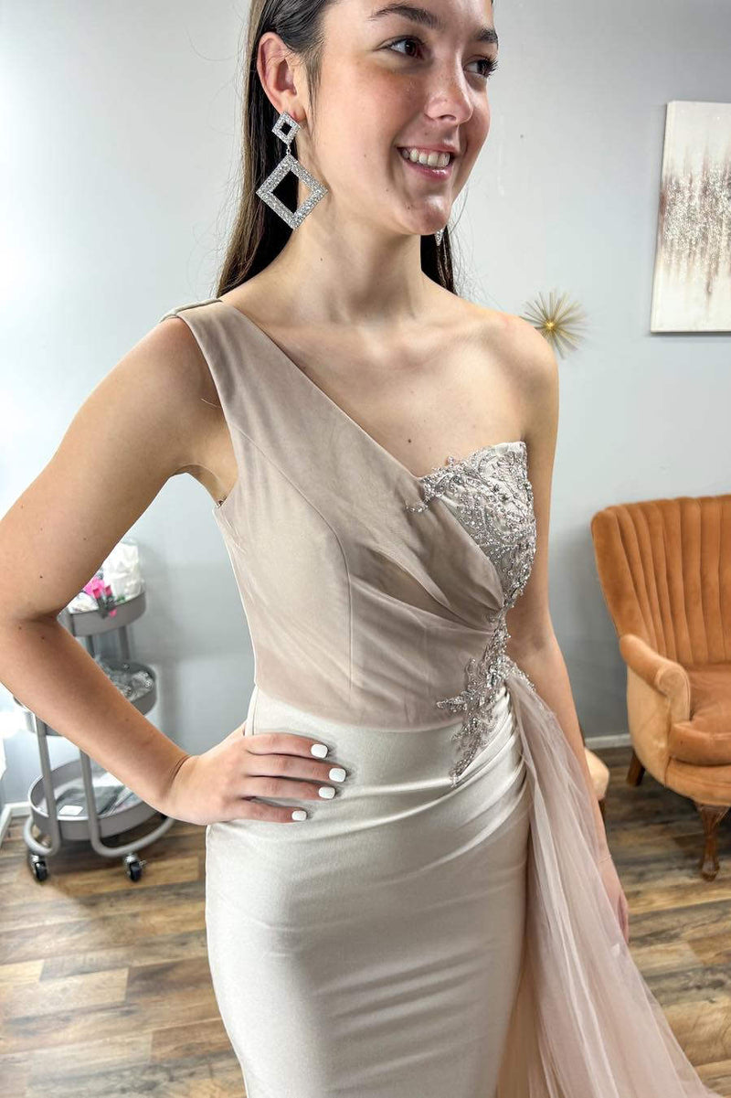 One Shoulder Nude Appliqeus Long Prom Dress with Cape