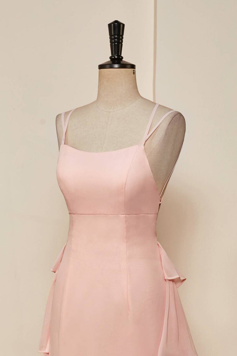 Straps Pink Ruffle Tiered Chiffon Long Prom Dress