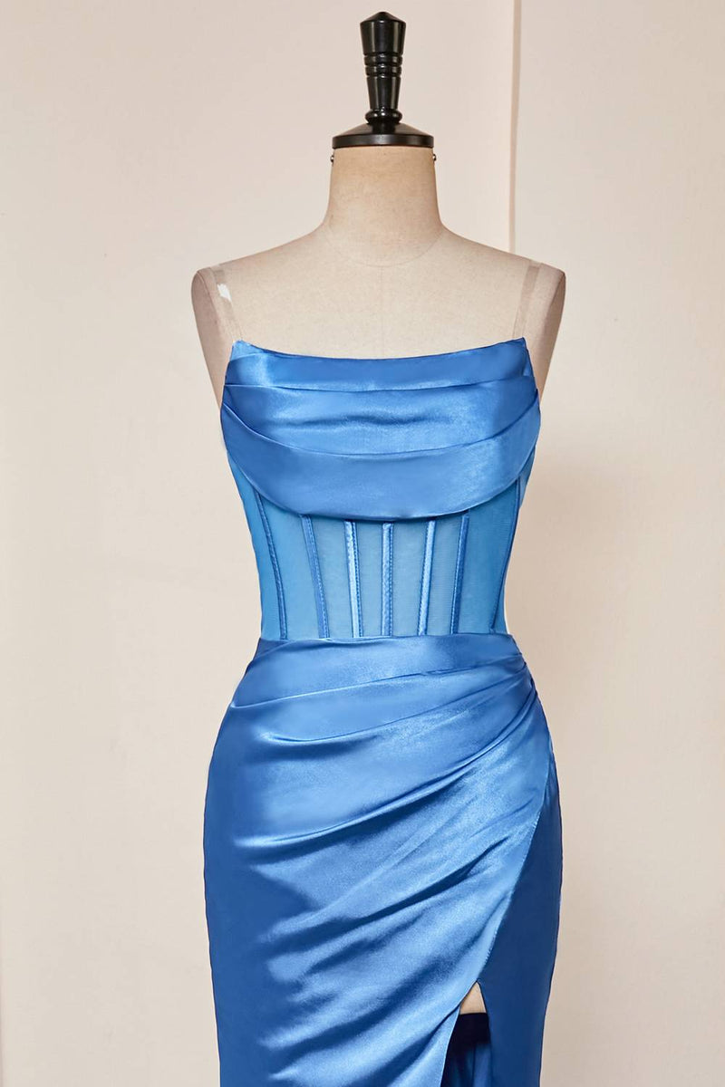 Strapless Blue Ruched Satin Prom Dress with Slit