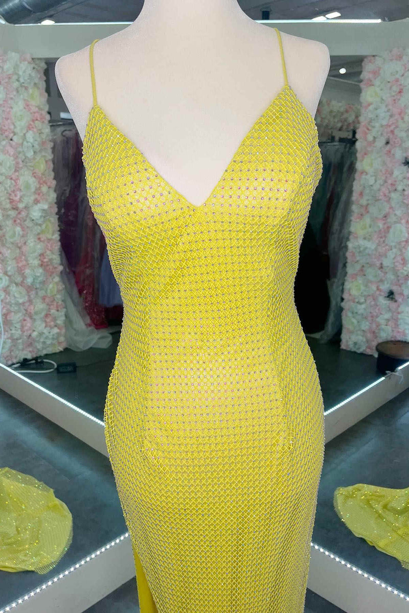 Straps Yellow Rhinestone Grid Slit Long Prom Dress