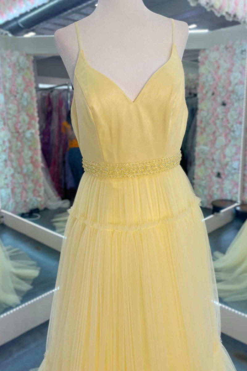 Light Yellow V-Neck Tulle A-Line Long Prom Dress