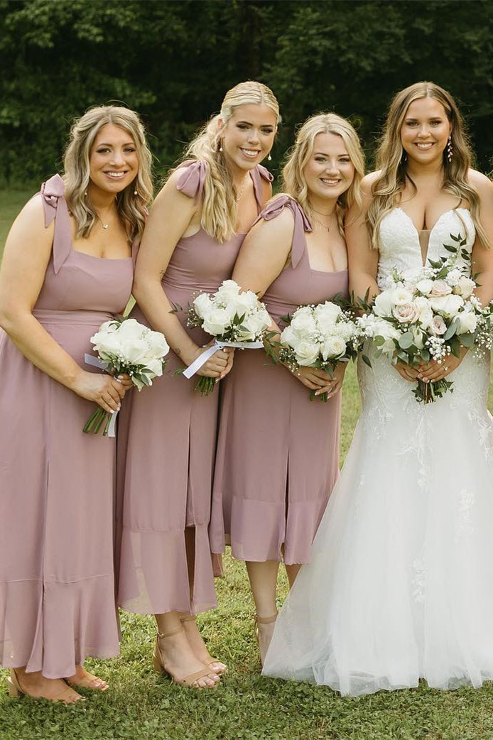 Tie Shoulder Dusty Rose Square Neck Chiffon Midi Bridesmaid Dress