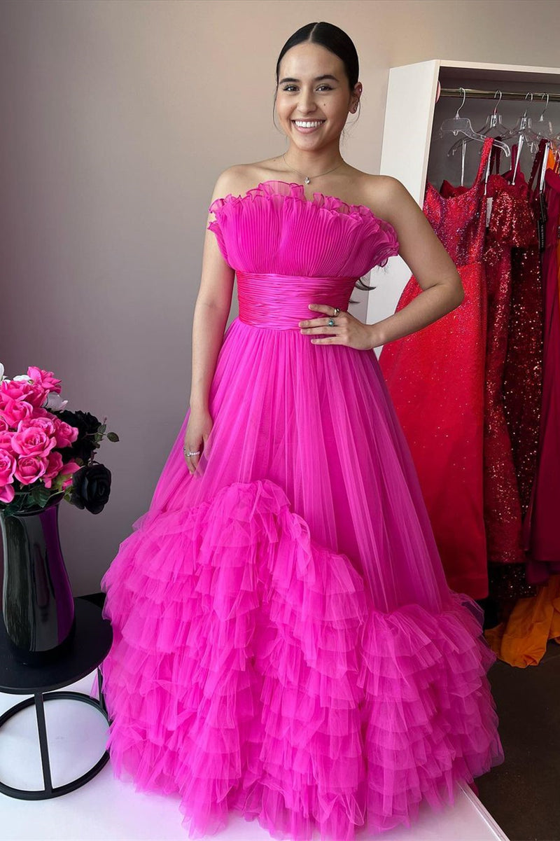 Princess Fuchsia A-line Strapless Tulle Multi-Layers Long Prom Dress