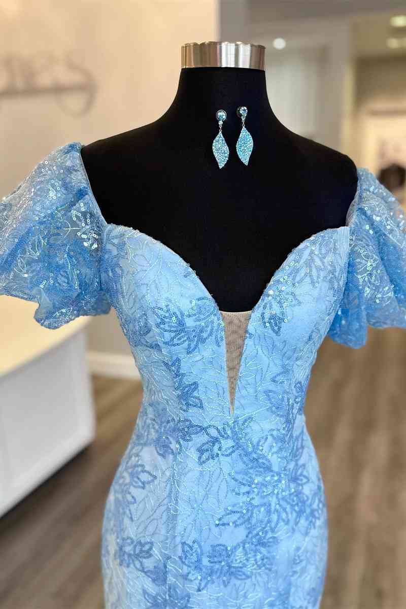 Long Light Blue Puff Sleeves Mermaid Prom Dress with Sequins