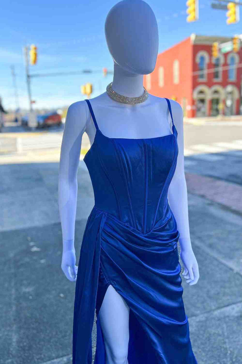 Straps Ruched Royal Blue Long Prom Dress with High Slit