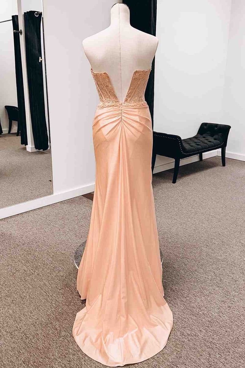 Peach Strapless Mermiad Satin Applique Slit Long Prom Dress