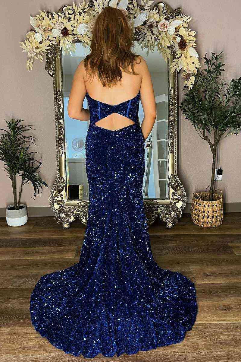 Blue Strapless Mermiad Sequins Slit Long Prom Dress