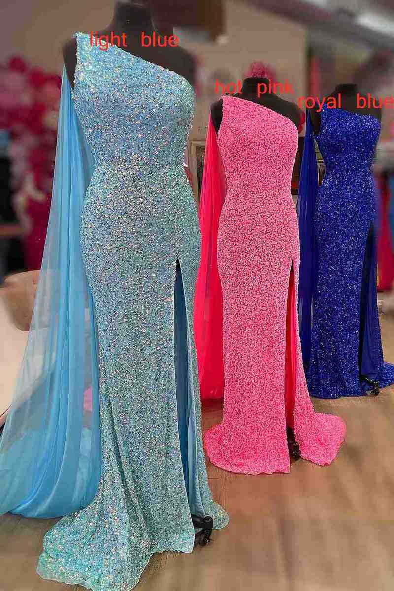 Blue One Shoulder Side Slit Long Prom Dress with Tassel