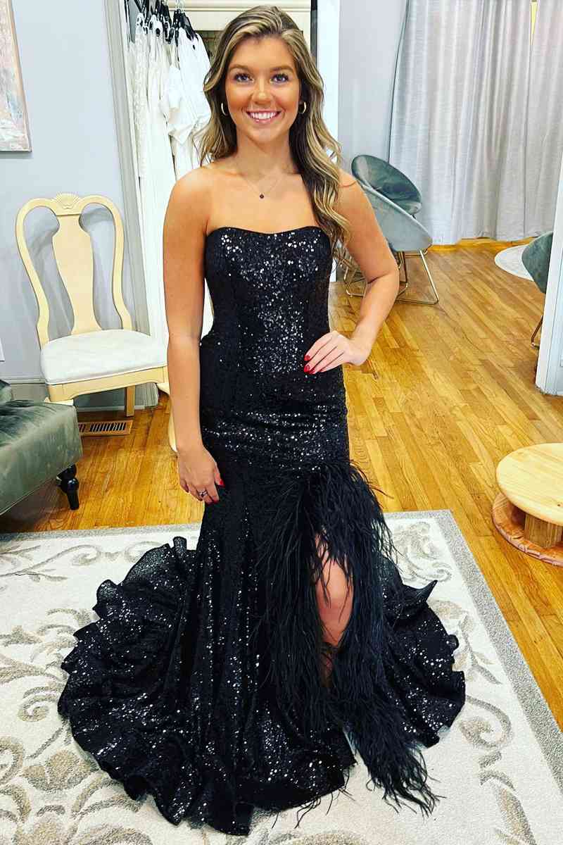 High Slit Sequin Black Long Party Dress with Feather Hem