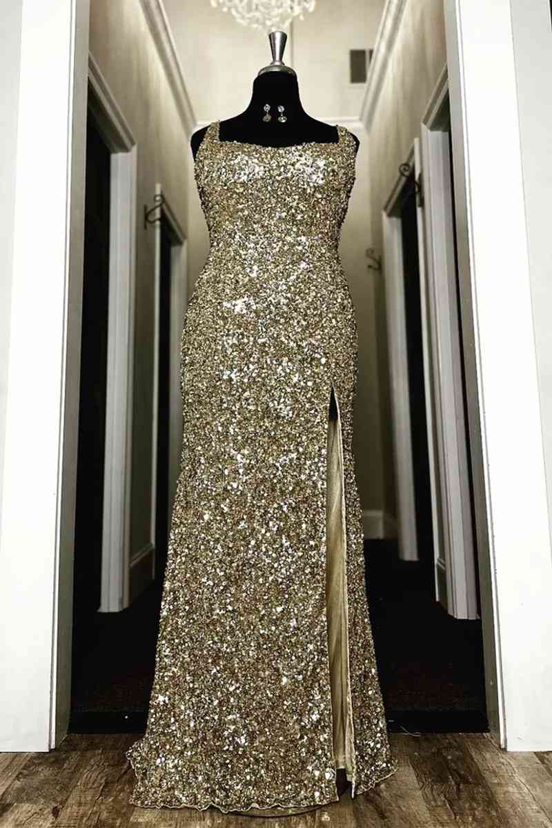 Lace-Up Square Neck Hot Pink Sequined Long Party Dress