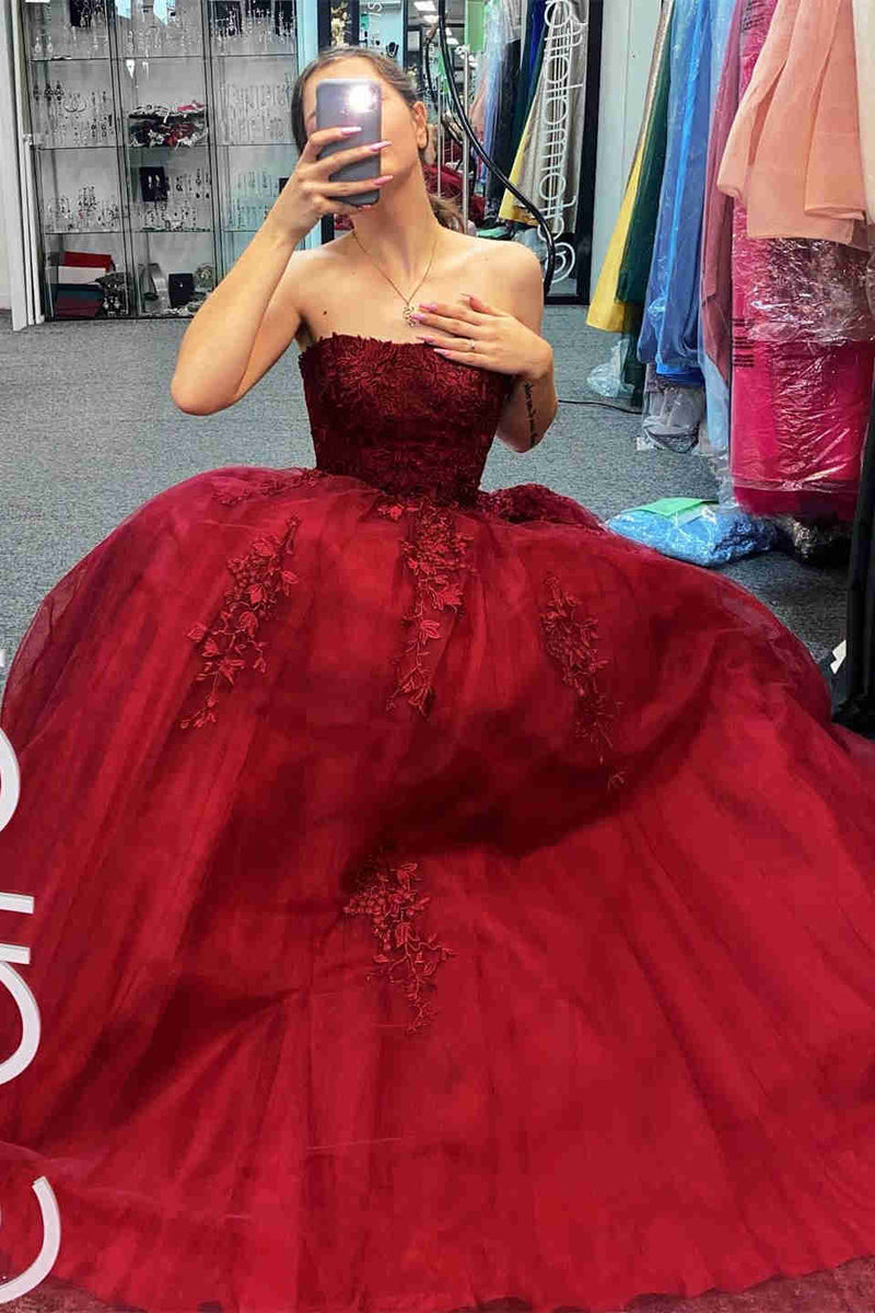 A-Line Strapless Fuchsia Appliques Long Formal Dress