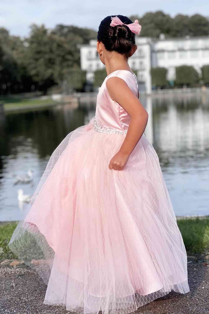Princess Pink Crew Neck Long Flower Girl Dress with Beaded Belt