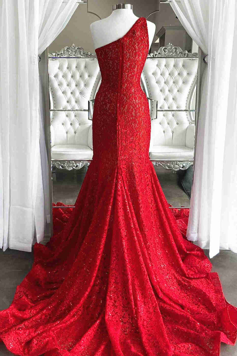 Mermaid Red One Shoulder Lace Long Prom Dress