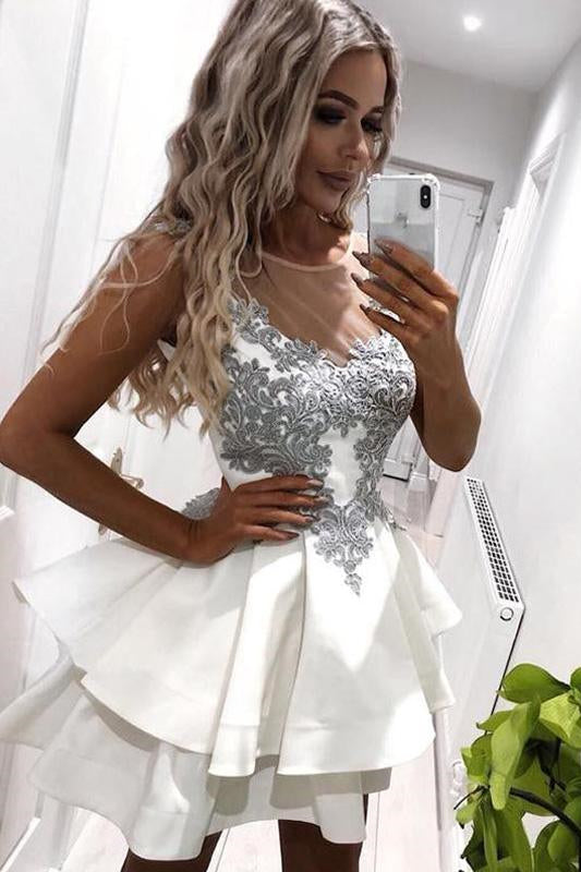 Cute White Illusion Neck Short Homecoming Dress with Appliques