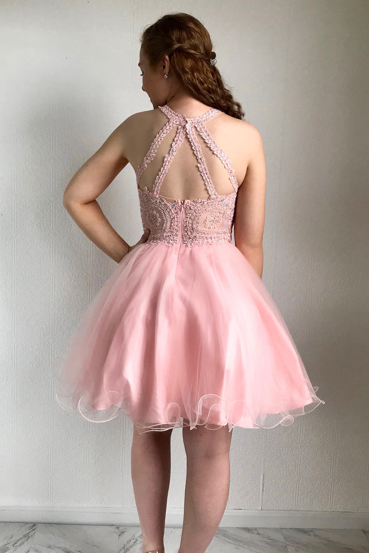 Cute Pink Crew Neck Beaded Short Homecoming Dress
