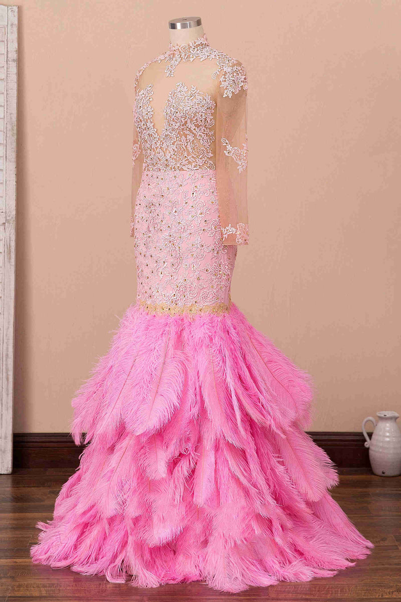 Mermaid Illusion Neck Pink Lace Prom Dress with Fur