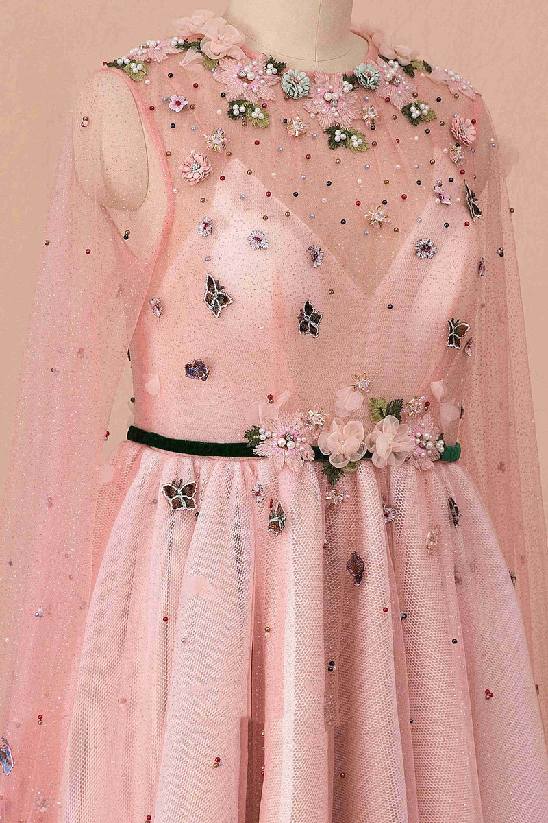 Vintage Pearl Pink Embroidery Party Dress with Illusion Sleeves