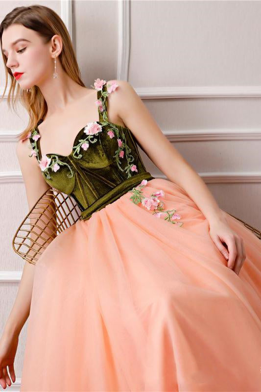 Elegant A-Line Velvet Top Long Prom Gown with Appliques