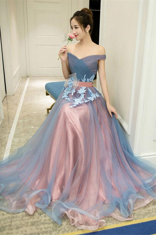 Chic Off the Shoulder Dusty Bule and Pink Long Prom Dress