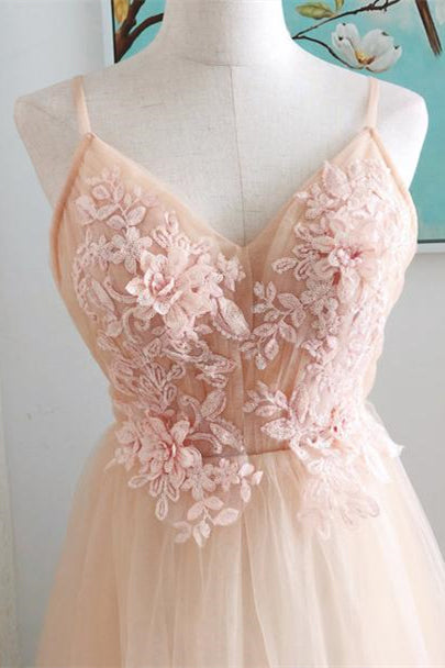 A-Line Lace Appliques Blush Pink Tulle Prom Dress