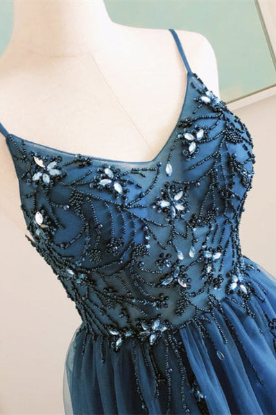 Elegant V-Neck Beaded Navy Blue Long Prom Dress