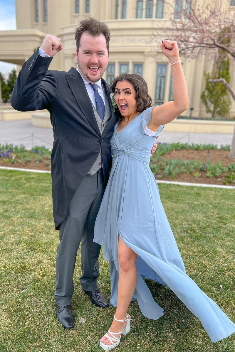 Cowl Neck Tea Length Baby Blue Bridesmaid Dress with Slit