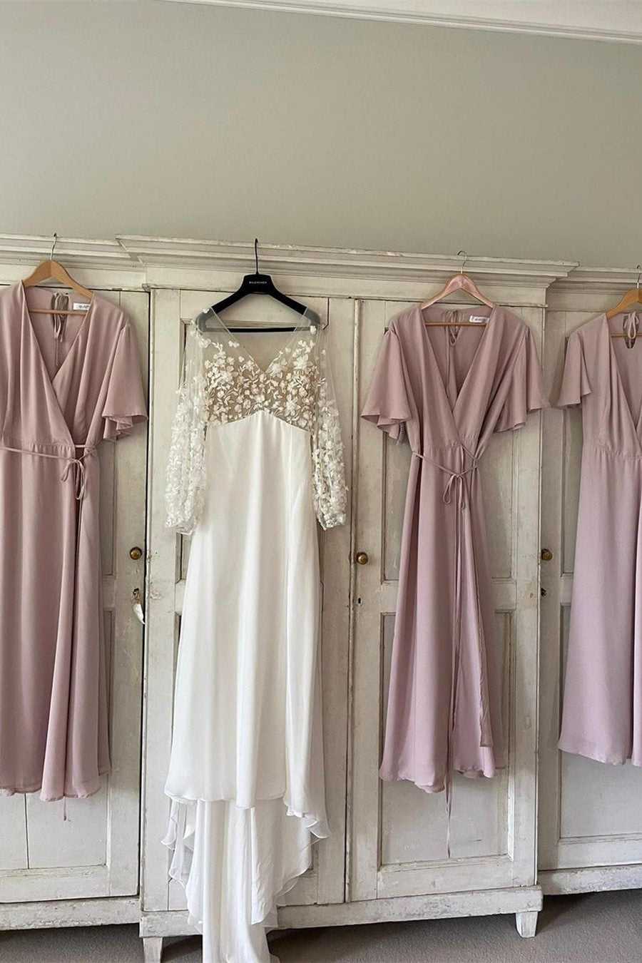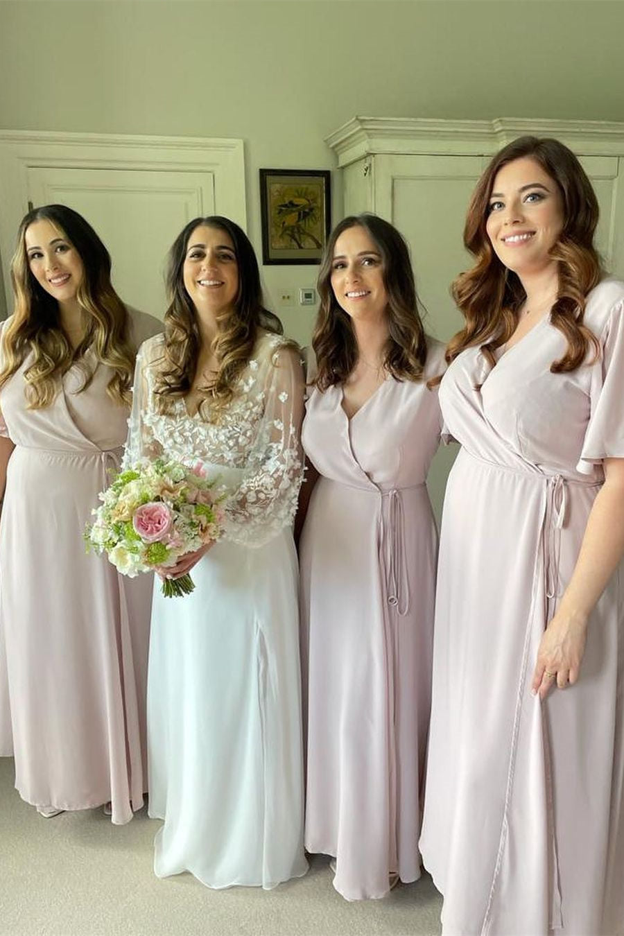 Elegant pink long bridesmaid dress features with v-neck, short sleeve and tie belt.