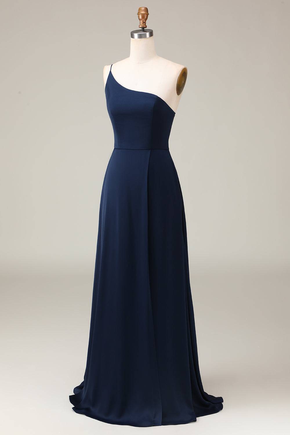 This beautiful one-shoulder chiffon dress features a flattering A-line skirt and zipper back for an elegant look. Perfect for any bridesmaid or special occasion.