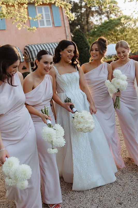 Chic Satin Fitted One Shoulder Sleeveless Empire Bridesmaid Dress With Slit