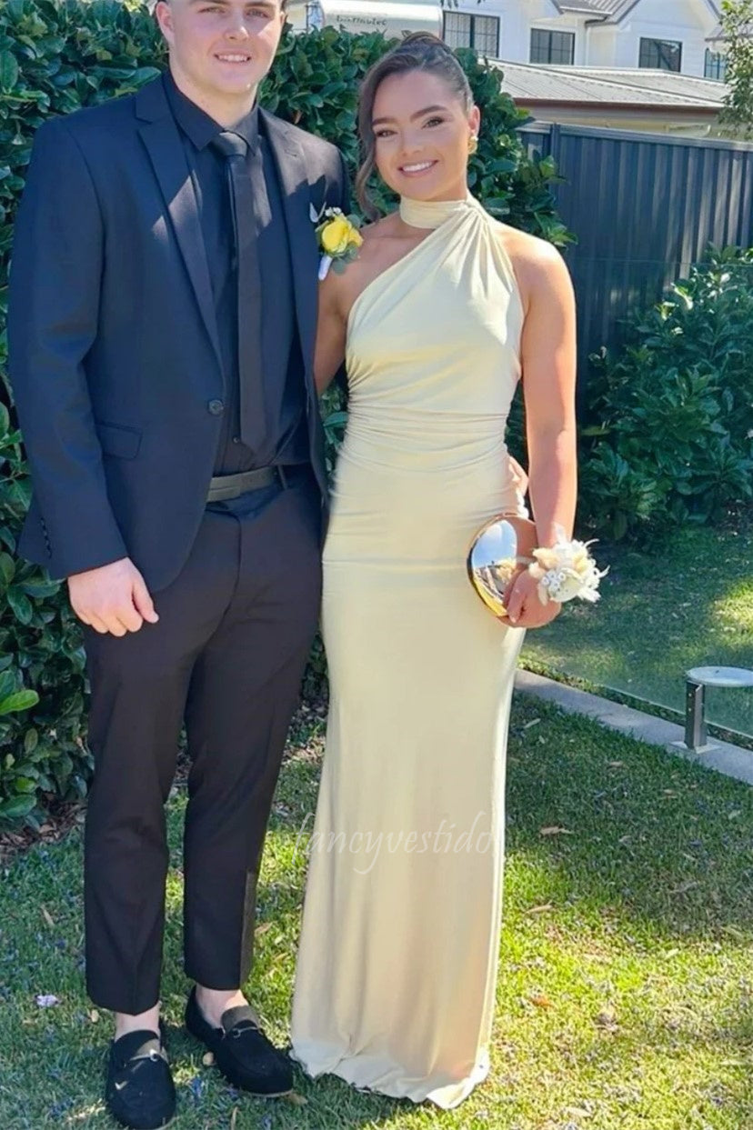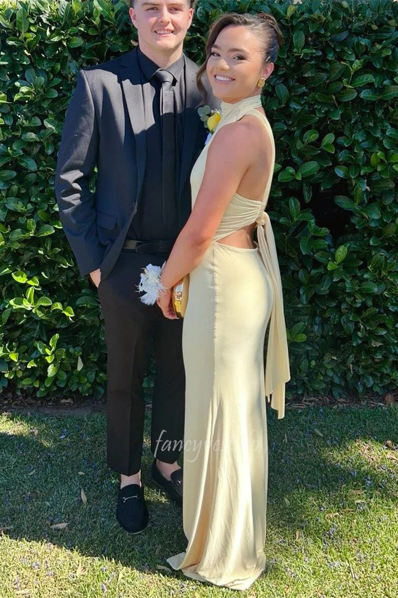 Elegant Yellow Halter Sheath Satin Maxi Prom Dress