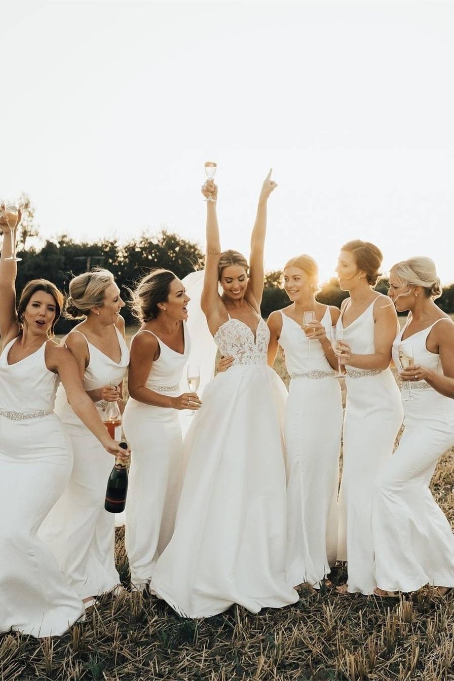 The white bridesmaid dress is perfect for your special day. This timeless style features a flattering V-neckline, delicate spaghetti straps, beaded belt detail, and a breathtaking mermaid skirt. Showcase your curves in this timeless and elegant dress.