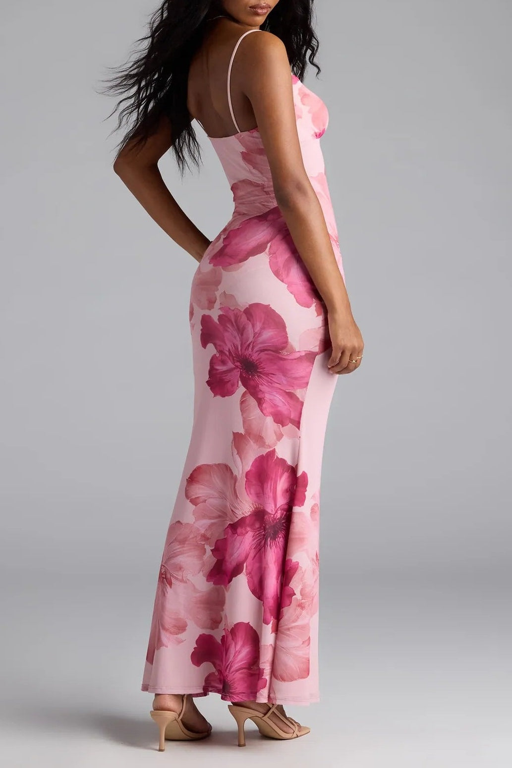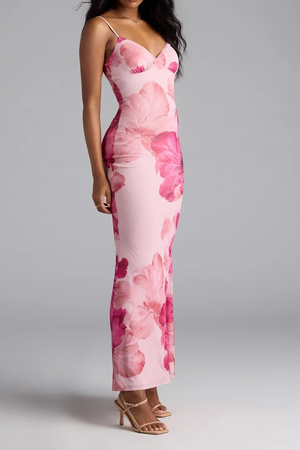 Fitted V-Neck Spaghetti Straps Floral Party Evening Dress