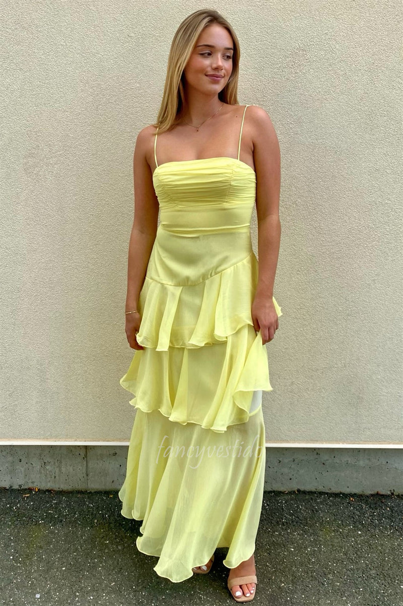 Spaghetti Straps Yellow Ruffle Chiffon Maxi Prom Dress