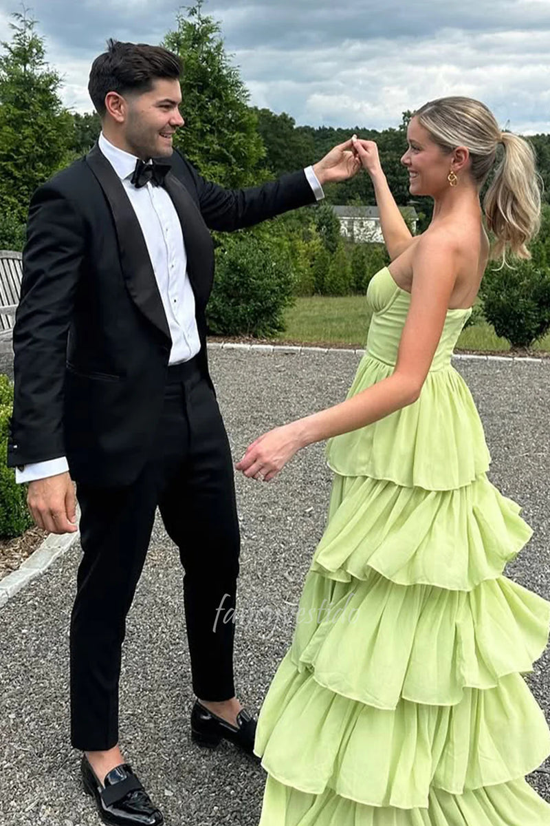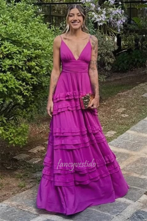 Straps V-Neck Empire Waist Ruffled Layered A-Line Prom Dress
